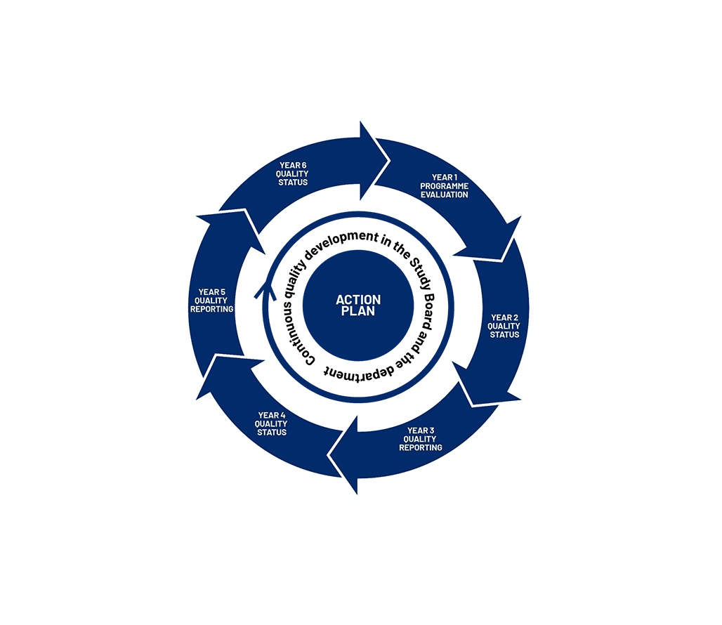 Programme evaluations with participation of external experts are carried out every six years by all departments at AAU. The programme evaluation (in year 1) initiates the six-year cycle with annual quality follow-up for all study programmes as shown in the figure above.